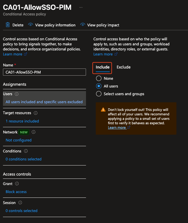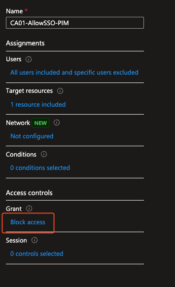 This policy is now active. It will block all users from accessing the application unless they are a member of the excluded group. Because PIM manages temporary membership in that group, this effectively forces all administrative access to go through your PIM activation workflow.