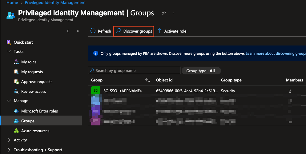 - From the PIM blade, click Groups, then select your newly onboarded administrative group.
