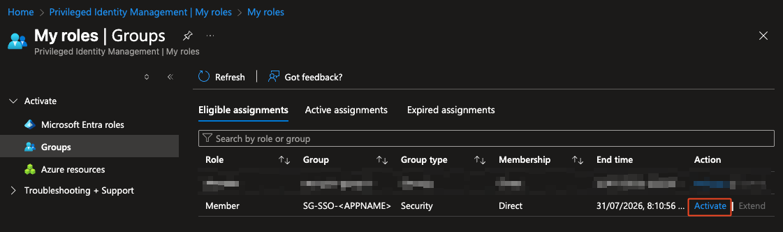 - Under Eligible Assignments, they should see the administrative group. Click Activate.